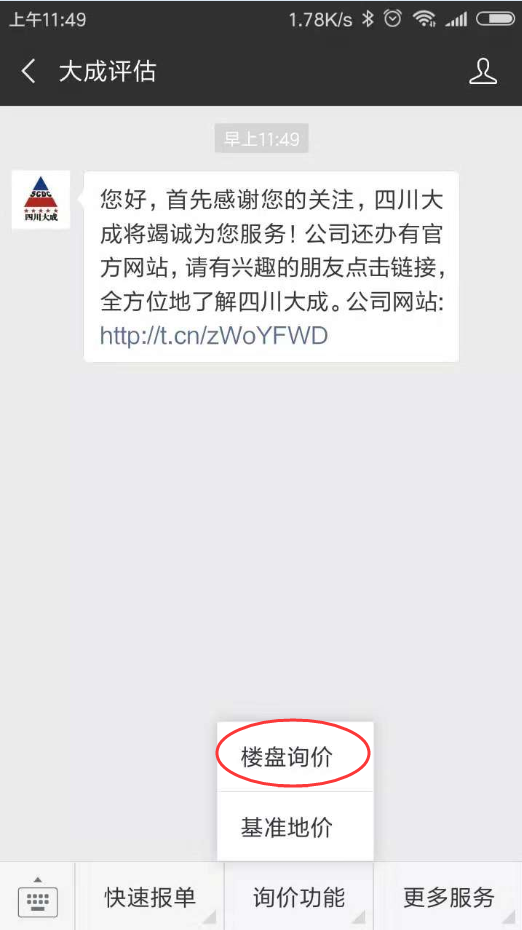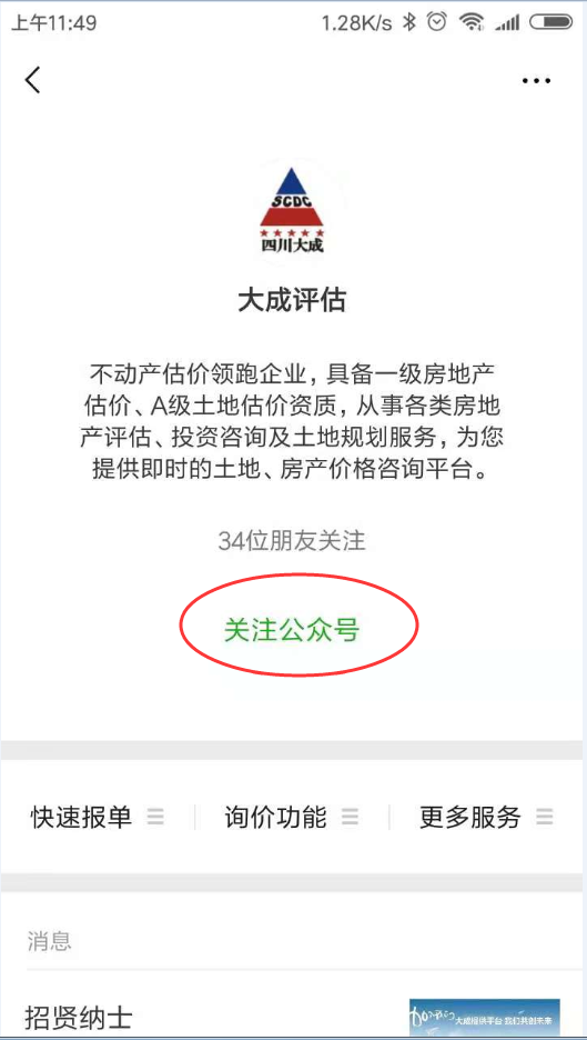 2.單擊關(guān)注大成評(píng)估,進(jìn)入公眾號(hào)。