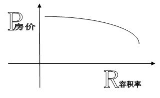 在同一宗地內(nèi),當(dāng)其他規(guī)劃指標(biāo)不變的前提下,隨著容積率的增加,其建筑面積將增加,同時樓層數(shù)也會增加,其樓間距與建筑物高度的比例變小、住宅類的居家氛圍相對會下降,這些因素均對房價具有減價影響。其影響曲線如下圖: