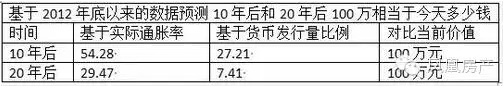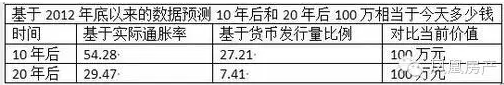 根據中國人民銀行公布的數據,計算出來2012年底以來中國的廣義貨幣供應量的年增長率約為13.9%,中國真實的年通貨膨脹率約在6.3%。我們不妨用這22個月的數據,來預測一下,現在的100萬元,10年后和20年后分別相當于今天的多少錢。