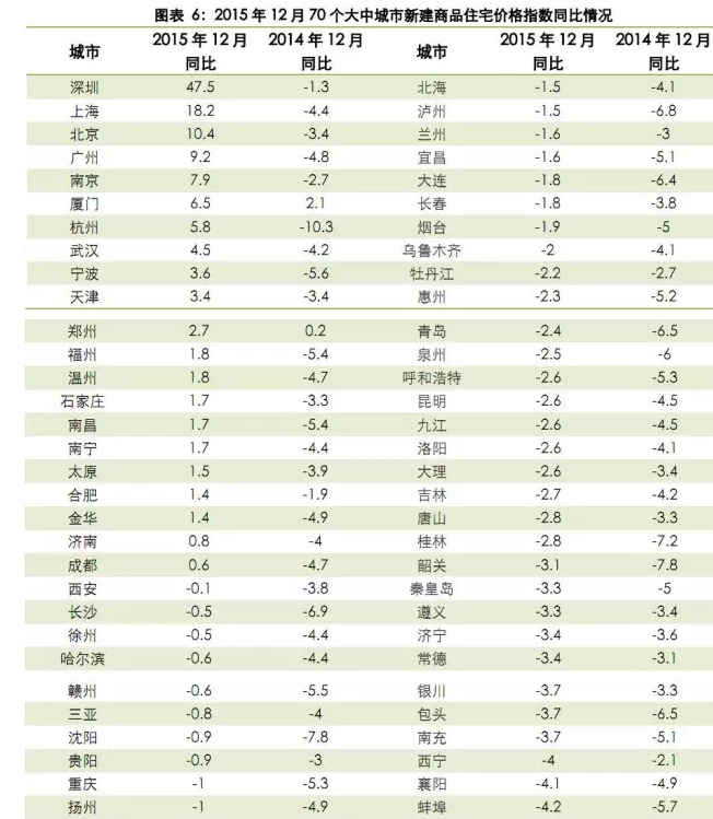 從70個大中城市新建商品住宅價格指數(shù)環(huán)比走勢來看, 2015年1-4月商品住宅價格出現(xiàn)較大幅度回升,5-12 月商品住宅價格漲幅趨于平穩(wěn)。其中,2015年 12 月70個大中城市中新建商品住宅價格指數(shù)同比上升較大的城市有深圳、上海、北京、廣州、南京、廈門、杭州、武漢、寧波、天津,同比下降較大的城市有丹東、湛江、錦州、岳陽、蚌埠。