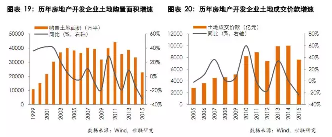 2015年,房地產(chǎn)開發(fā)企業(yè)土地購置面積 22811萬平方米,同比下降 32%;全國房地產(chǎn)開發(fā)企業(yè)土地成交款 7622 億,同比下降 24%。