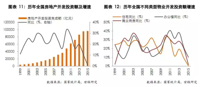2015年全國房地產(chǎn)開發(fā)投資完成95979億元, 同比增長1.0%,其中,住宅增長0.4%,辦公樓增長10.1%,商業(yè)用房增長1.8%。2013 年以來,房地產(chǎn)投資增速從20%左右延續(xù)下滑。