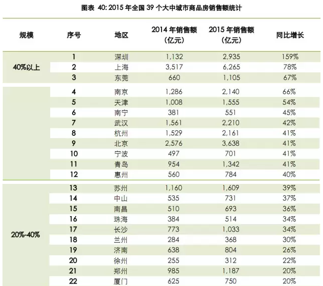 世聯(lián)行統(tǒng)計的全國39個重點中大城市的銷售額如下表所示,合計銷售額比去年同期增長 35%。從增幅來看,其中有 12 個城市達到銷售額同比增長 40%以上,僅 5 個城市銷售額出現(xiàn)同比下跌趨勢,總體情況良好。