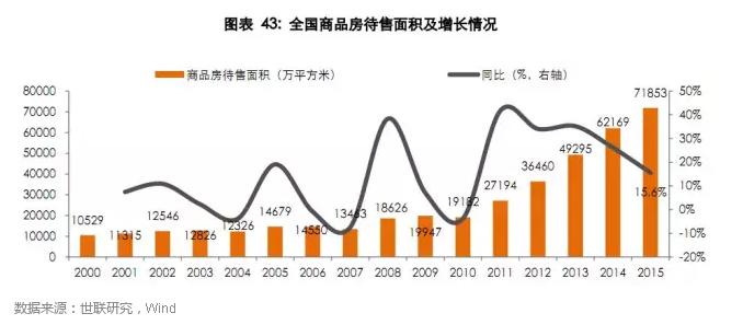 至 2015 年,全國商品房待售面積高達71853 萬平米,同比增長15.6%,在待售面積不斷上升的情況下,房地產(chǎn)開發(fā)投資的速度也在下滑,去庫存成為當務之急。