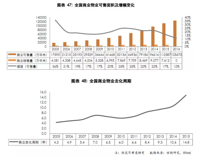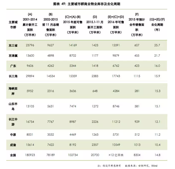 相對于住宅的庫存和去化周期,全國商業(yè)的庫存壓力更大,預計 2016 年累計可售面積達到 12.6 億平米,而去化時間則高達 14.8 年。