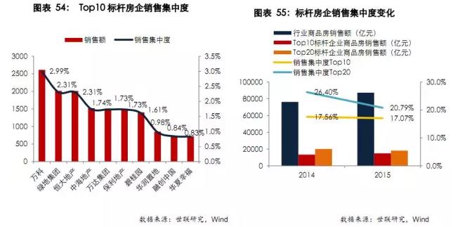 從銷售業(yè)績來看,房企之間的業(yè)績明顯回暖,大者恒大,強者恒強的市場局面將成為房地產(chǎn)行業(yè)新常態(tài)之一。從市場集中度的角度來看, 2015 年全年銷售業(yè)績Top10 的上市房企銷售總額達到 14897億元,比去年13396億元同比增長11.2%。
