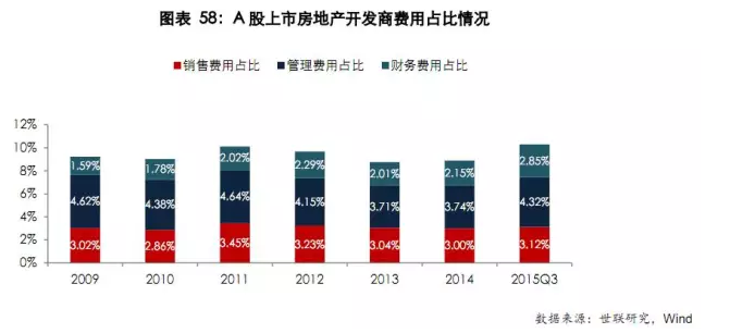 從今年三費占比的變化,我們可以看到,中國上市房企在銷售費用,財務費用還有管理費用的支出占比較 2014 年有了進一步的提升,占比達到了10.29%,為近6 年來最高的水平,比2014 年年底三費占比上漲1.4個百分點。