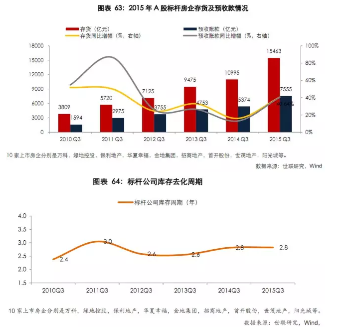 從化周期來看,標桿房企 2015 年第三季度的去化周期與 2014 年第三季度的去化水平持平,但是與行業(yè)平均水平的 3.3 年相比,庫存壓力相對較小。