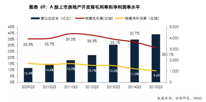 進一步的研究表明,今年前三季度上市房企毛利率與凈利潤率進一步下降,其中毛利率僅為 28.11%,比去年同期進一步下滑 4.6 個百分點。最新的銷售凈利潤率跌破 10%、為 9.37%,比去年年底下滑 1.73 個百分點。