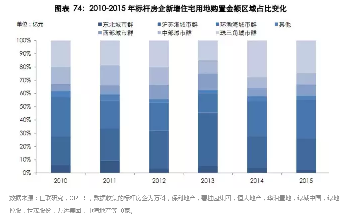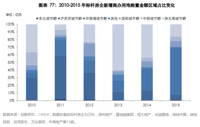 從標桿企業(yè)拿地的商辦用地規(guī)劃建筑面積我們可以看到,2015 年新增購置商辦用地建筑面積主要集中在環(huán)渤海城市群與西部城市群。
