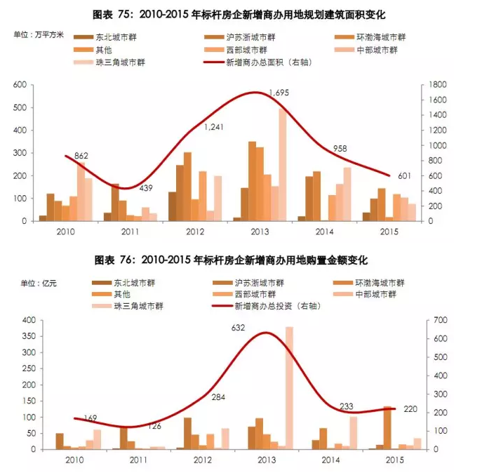 我們進一步從2010-2015 年房企拿地的規(guī)劃建筑面積與土地購置金額這兩個方面進行了詳細的比較。