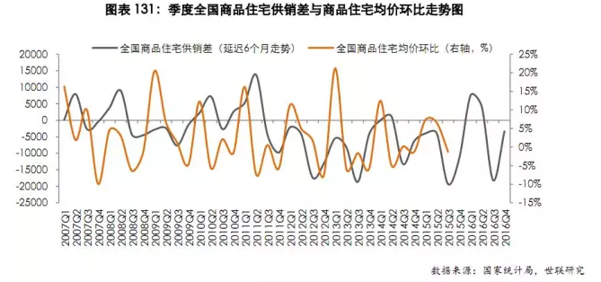 從歷年全國商品住宅供銷差和歷年全國商品住宅均價環(huán)比走勢看,整體趨勢基本吻合,2016 年的全國商品住宅價格走勢將會好于 2015年,2016 年上半年及4 季度市場價格上行壓力將會有所增加。
