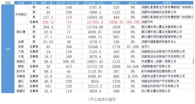 數(shù)據(jù)顯示,5月成都土地市場成交土地共18宗,土地成交面積1223.97畝,同比上漲約15%;出讓總金額約32億元,同比上漲約570%。