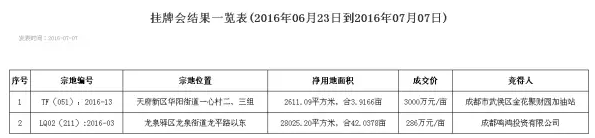 值得注意的是,記者從成都市公共資源交易中心官網(wǎng)查詢到的土拍結(jié)果顯示:天府新區(qū)華陽街道一心村二、三組這塊近4畝的土地被以3000萬元/畝,溢價757%的價格拿下,競得者是來自成都市武侯區(qū)金花聚財(cái)園加油站。