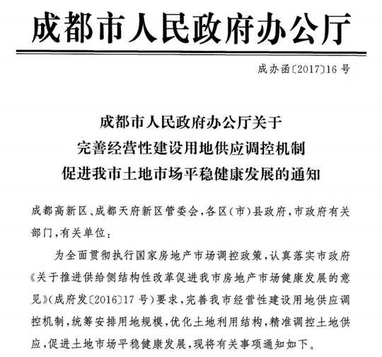 為了全面貫徹執(zhí)行國家房地產(chǎn)市場調(diào)控政策,完善成都市經(jīng)營性建設(shè)用地供應(yīng)調(diào)控機(jī)制,促進(jìn)土地市場平穩(wěn)健康發(fā)展。近日,成都市人民政府辦公廳印發(fā)了關(guān)于《完善經(jīng)營性建設(shè)用地土地調(diào)控機(jī)制促進(jìn)我市土地市場平穩(wěn)健康發(fā)展的通知》。