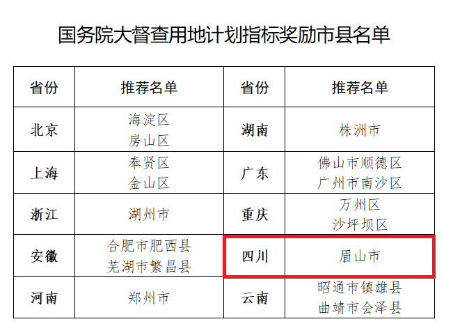 這其中,咱們四川省眉山市就因土地節(jié)約集約利用成效好,閑置土地少,且用地需求量大而獲得表揚,還獲得國務院大督查土地利用計劃指標獎勵5000畝,成為四川省唯一獲得這項指標獎勵的城市。