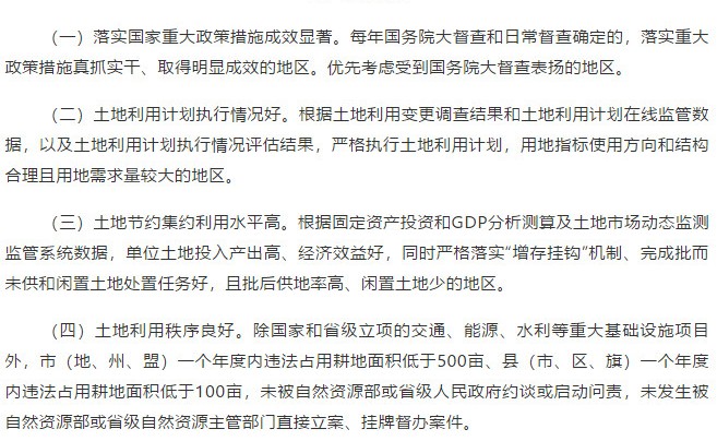 依據(jù)部獎勵實施辦法,按照落實國家重大政策措施成效顯著、土地利用計劃執(zhí)行情況好、土地節(jié)約集約利用水平高、土地利用秩序良好等四個條件作為評估測算因素設置的遵循。
