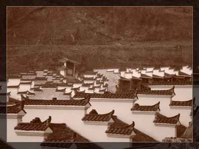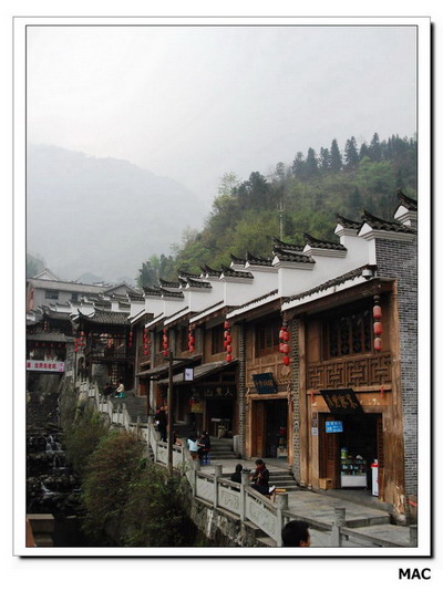 小溪澗流街心,順著小溪沿路而上,溪上架有三座拱橋和一座廊橋,將古街相連,名為:往生橋、今生橋、來生橋和普渡眾生橋。老街整體古樸雅致的建筑風(fēng)貌,深邃厚重的文化底蘊(yùn),小橋流水的寫意風(fēng)格,流露出濃厚的懷舊風(fēng)情。老街按照安徽徽派民居建筑風(fēng)格而建,逶迤狹長,上接寶藏寺,下連接待中心,數(shù)十幢獨(dú)立而又連接緊密的小樓串成長達(dá)近千米的小街,街面從吊腳樓下穿過,甚有蘇杭古鎮(zhèn)風(fēng)格。每幢單體店鋪的屋頂都設(shè)計(jì)有江南民居格調(diào)的烽火墻,墻體鱗次櫛比、錯(cuò)落有致。