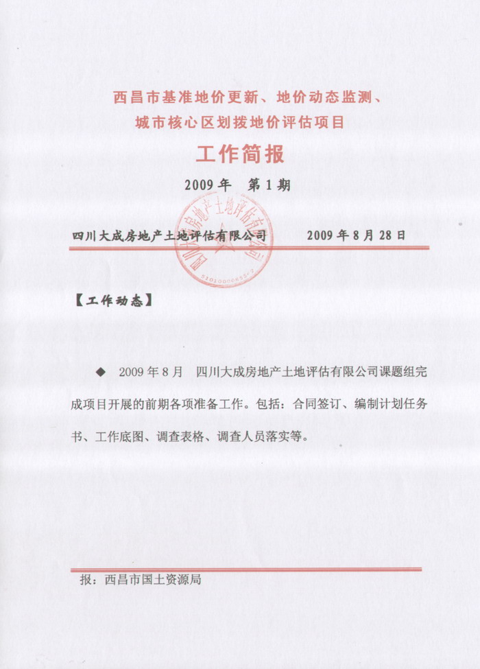 西昌市基準(zhǔn)地價(jià)更新、地價(jià)動(dòng)態(tài)監(jiān)測(cè)、劃撥地價(jià)評(píng)估項(xiàng)目工作簡(jiǎn)報(bào)第一期 2009-09-04 00:00:00        本網(wǎng)站