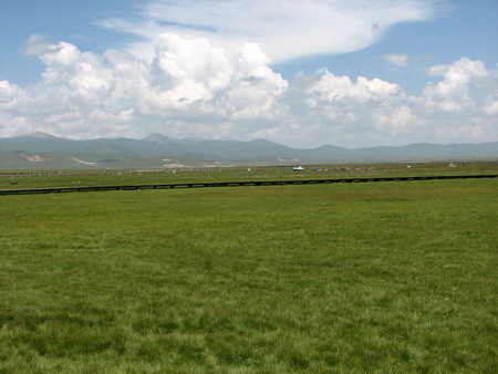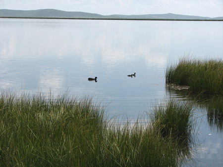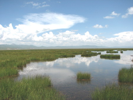 8月的花湖雖不及6、7月般簇簇野花、五彩斑瀾,但綠草如茵、湖岸邊蘆葦草豐茂,壯觀的草原蜃景妙不可言;湖水湛藍(lán)清透,是那種無法形容的純凈;繾綣在水天之間的云彩,有著魔力般妖艷;令人想越過棧道一直走到湖中心去,或許那里,會有更大的幸福。