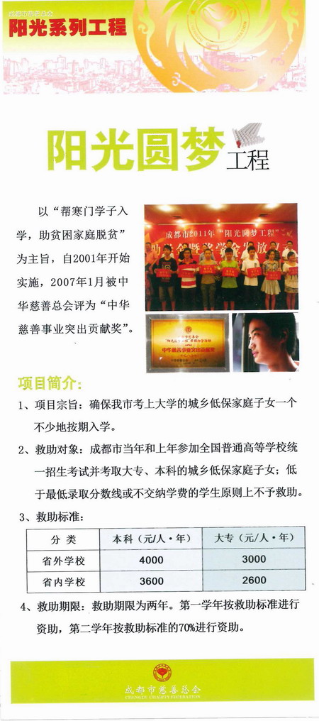 2014年四月,我公司積極響應(yīng)成都市慈善總會(huì)的號(hào)召,參與到“陽光圓夢(mèng)工程”行動(dòng)中來,此次活動(dòng)主要以“幫寒門學(xué)子入學(xué),助貧困家庭脫貧”為主題,確保我市考上大學(xué)的城鄉(xiāng)低保家庭子女按期入學(xué), 讓我們每個(gè)人都行動(dòng)起來,圓更多寒門學(xué)子讀書的夢(mèng)。