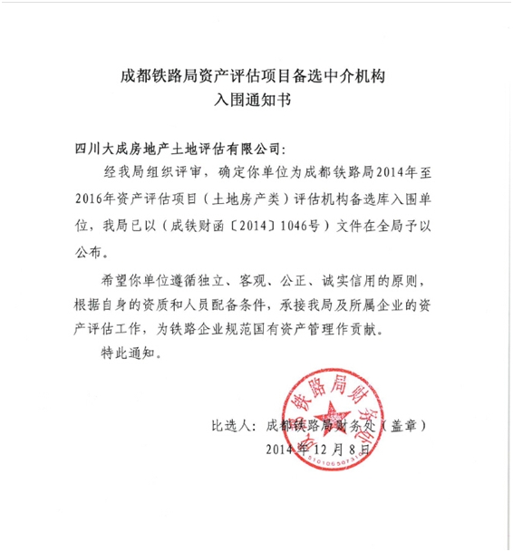 參加此次入圍共計(jì)20家評(píng)估公司,我公司于2014年12月8日收到成都市鐵路局資產(chǎn)評(píng)估項(xiàng)目備選庫中介機(jī)構(gòu)入圍通知書并將遵循獨(dú)立、客觀、公正、誠實(shí)信用的原則,根據(jù)自身的資質(zhì)和人員配備條件,承接貴局及所屬企業(yè)的資產(chǎn)評(píng)估工作,為鐵路企業(yè)規(guī)范國有資產(chǎn)管理作貢獻(xiàn)。