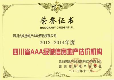 公司榮獲年度“四川省AAA級誠信房地產(chǎn)估價機(jī)構(gòu)”榮譽(yù)稱號