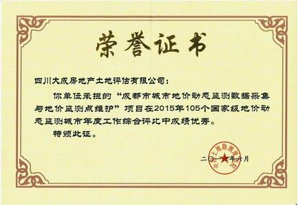 公司獲得“2015年成都市地價(jià)動態(tài)監(jiān)測”評比優(yōu)秀榮譽(yù)