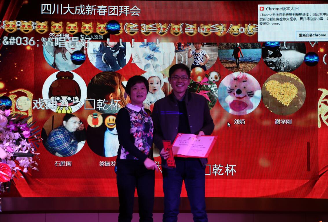團(tuán)拜會不僅給大家?guī)砹藲g聲笑語,同時(shí)也讓同事之間彼此的心更加貼近。公司領(lǐng)導(dǎo)與員工親情互動、激動人心的抽獎活動,讓歌聲、掌聲、歡呼聲一直在會場上蕩漾。整場聯(lián)歡會高潮迭起,呈現(xiàn)出大成這個(gè)大家庭的歡樂和諧。