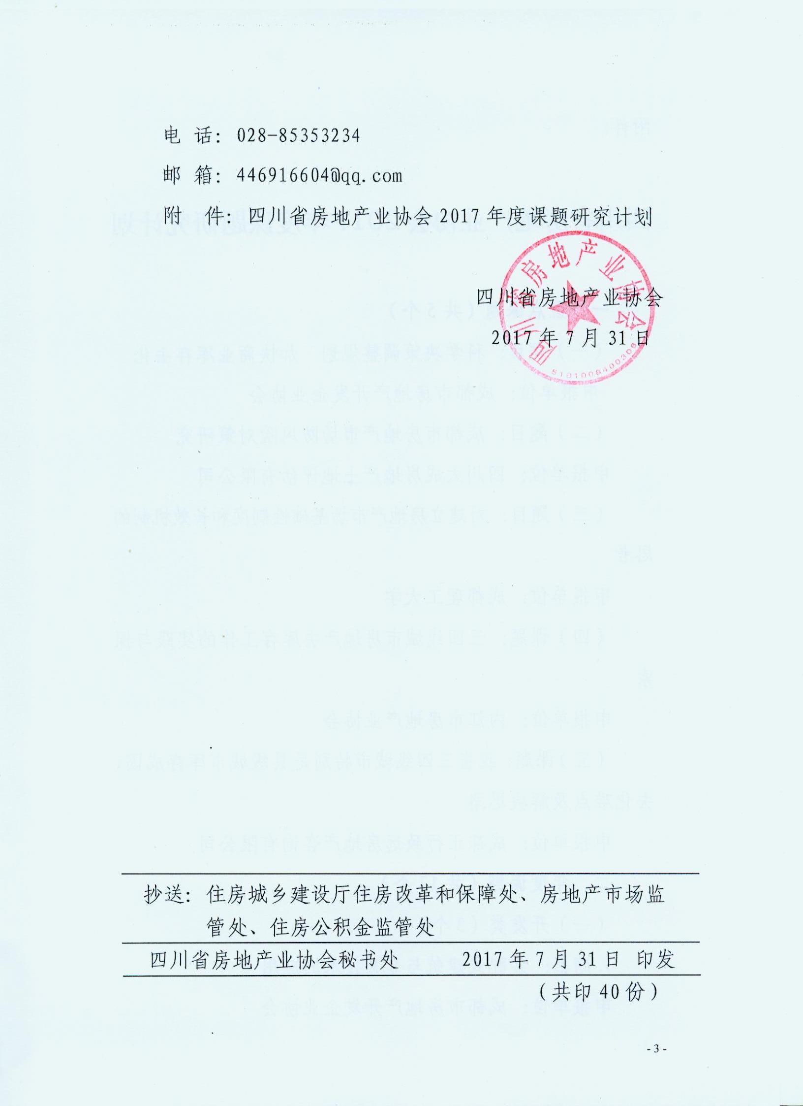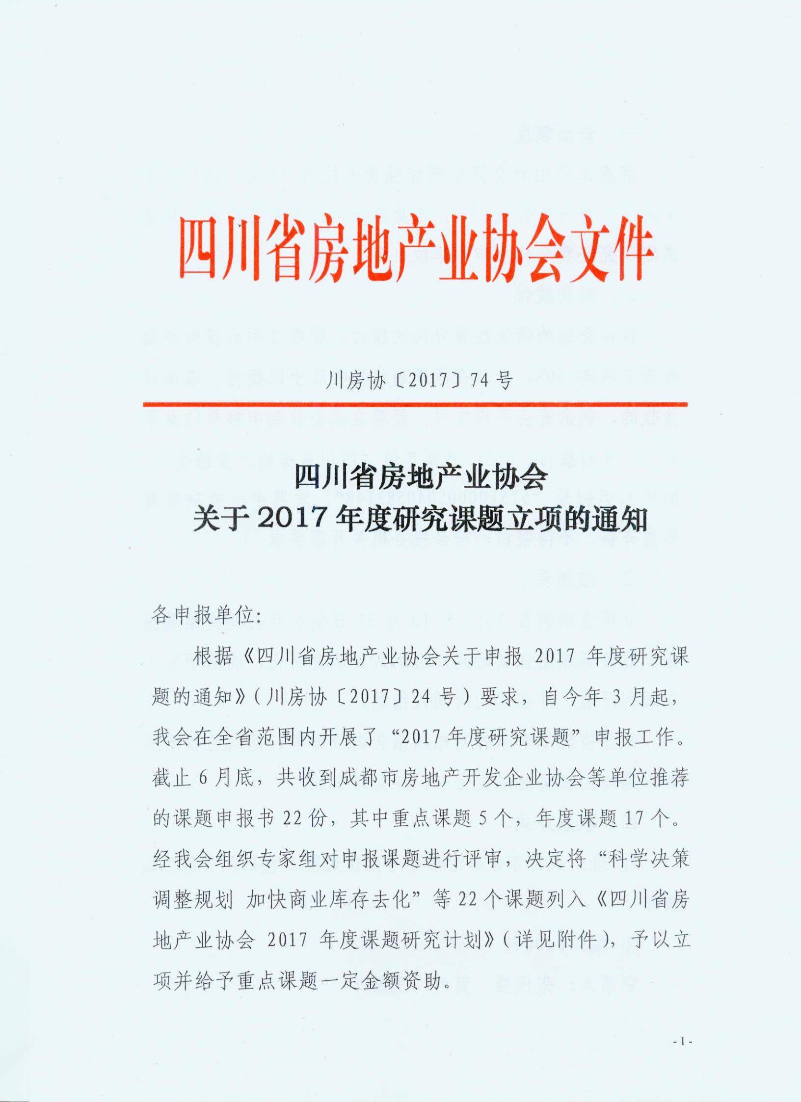 根據(jù)《四川省房地產(chǎn)業(yè)協(xié)會關(guān)于申報2017年度研究課題的通知》(川房協(xié)【2017】24號)要求,自今年3月起,四川省房地產(chǎn)業(yè)協(xié)會在全省范圍內(nèi)開展了“2017年度研究課題”的申報工作。經(jīng)四川省房地產(chǎn)業(yè)協(xié)會組織專家對申報課題進(jìn)行評審,我公司《成都市房地產(chǎn)市場防風(fēng)險對策研究》成功申報為重點課題。目前我公司正抓緊時間組織人員認(rèn)真研究,確保研究工作的順利開展,并在規(guī)定時間內(nèi)結(jié)題。