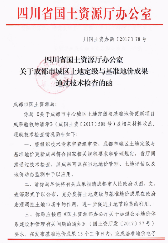 我公司承擔(dān)的“成都市中心城區(qū)土地定級與基準(zhǔn)地價(jià)更新項(xiàng)目”在經(jīng)歷了前期準(zhǔn)備、外業(yè)調(diào)查、內(nèi)業(yè)測算、成果意見交流及項(xiàng)目成果聽證等各階段后,于2017年8月24日由省國土資源廳組織相關(guān)專家對該項(xiàng)目成果進(jìn)行了驗(yàn)收,并于9月6日頒發(fā)該成果通過技術(shù)檢查的函。