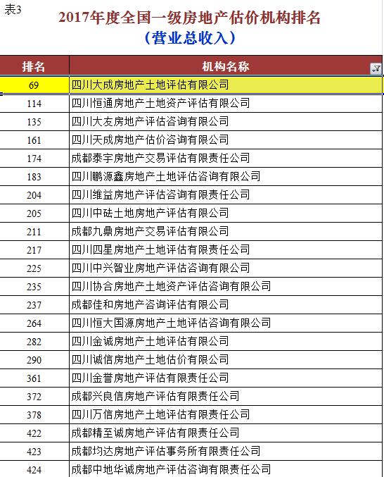 3月23日中國房地產(chǎn)估價師與房地產(chǎn)經(jīng)紀(jì)人學(xué)會公布了2017年度全國一級房地產(chǎn)估價機構(gòu)業(yè)績排名情況。排名根據(jù)全國546家在2017年12月31日之前取得一級資質(zhì)的房地產(chǎn)估價機構(gòu)上報的2017年房地產(chǎn)估價信用檔案信息,通過按營業(yè)總收入、按評估建筑面積、按評估土地面積、按評估總價值等綜合數(shù)據(jù),按相關(guān)指標(biāo)進行了排名,我公司排名四川省前三甲!