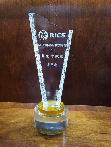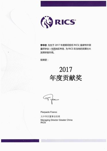 2018年4月,RICS(皇家特許測(cè)量師學(xué)會(huì))為我公司領(lǐng)導(dǎo)李華忠先生頒發(fā)了“2017年度貢獻(xiàn)獎(jiǎng)”,對(duì)李總為RICS在華西地區(qū)發(fā)展壯大所作出的貢獻(xiàn)給與了肯定。