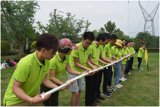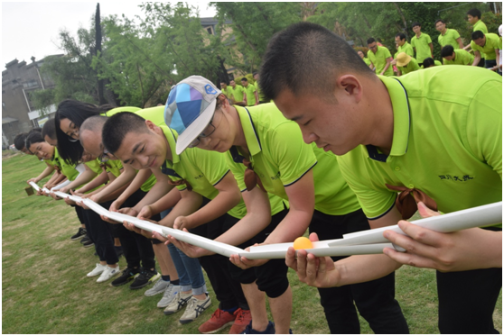 午間就餐結(jié)束稍作休息,新一輪的游戲開始了。通過(guò)上午各小隊(duì)的隊(duì)伍展示,最后兩兩結(jié)盟形成了ABC三個(gè)大隊(duì)。聯(lián)盟改變了一開始既定的模式,從“敵人”變成了“戰(zhàn)友”,依舊考驗(yàn)著默契和信任度。大成人很快適應(yīng)了這一節(jié)奏,開展了第三個(gè)環(huán)節(jié)“珠行萬(wàn)里”,每隊(duì)成員排成一豎排用PV管傳遞著小小的乒乓球,而此時(shí)的這顆球更成為了隊(duì)友們傳遞信任的紐帶。獲勝的隊(duì)伍更是掩飾不住臉上的喜悅,興奮的跳起來(lái)。