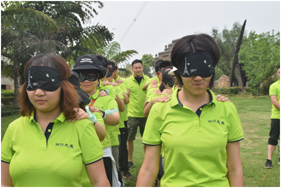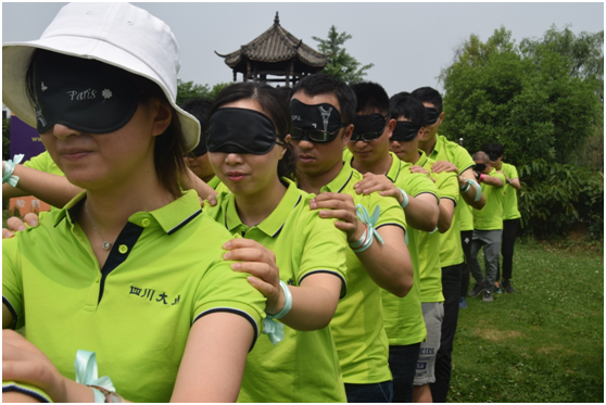 完成了第一輪的游戲,大家也對(duì)之前的失誤及時(shí)的討論總結(jié),為后面的游戲?qū)で蠼?jīng)驗(yàn)和教訓(xùn)。此時(shí)我們的積極性越來(lái)越高,隨即展開第二輪“穿越叢林”。聽名字似乎會(huì)有森林、索道之類的聯(lián)想,但在這里更有點(diǎn)盲人摸象的意思。每個(gè)團(tuán)隊(duì)只有一個(gè)主導(dǎo)者,帶領(lǐng)其他戴著眼罩的成員去尋找寶藏,游戲中所有人不能言語(yǔ),領(lǐng)導(dǎo)者也只能通過(guò)肢體行動(dòng)進(jìn)行指揮,充分考驗(yàn)團(tuán)隊(duì)成員彼此之間的信任和默契??赡苓@個(gè)游戲和我們平時(shí)工作很像,大部分的人并沒(méi)有明確的目標(biāo)或者方向,然而一個(gè)團(tuán)隊(duì)卻需要一個(gè)優(yōu)秀的引領(lǐng)者,成員們充分信任并緊隨引領(lǐng)者,這樣才能贏得工作目標(biāo)!