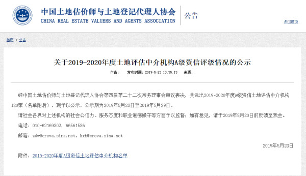 日前,中國(guó)土地估價(jià)師與土地登記代理人協(xié)會(huì)通過官網(wǎng)正式發(fā)布了"關(guān)于印發(fā)2019-2020年度A級(jí)資信土地評(píng)估中介機(jī)構(gòu)名單的通知"。