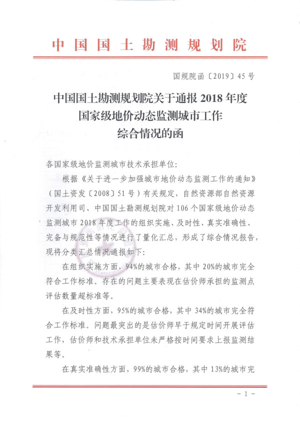2019年6月,在部自然資源開(kāi)發(fā)利用司、中國(guó)土地勘測(cè)規(guī)劃院對(duì)106個(gè)國(guó)家級(jí)地價(jià)動(dòng)態(tài)監(jiān)測(cè)城市2018年工作的組織實(shí)施、及時(shí)性、真實(shí)準(zhǔn)確性、完備與規(guī)范性等情況的綜合評(píng)比考核中,我公司承擔(dān)的“成都市2018年城市地價(jià)動(dòng)態(tài)監(jiān)測(cè)數(shù)據(jù)采集與地價(jià)監(jiān)測(cè)點(diǎn)維護(hù)”項(xiàng)目工作取得了全國(guó)排名第九的優(yōu)異成績(jī)。