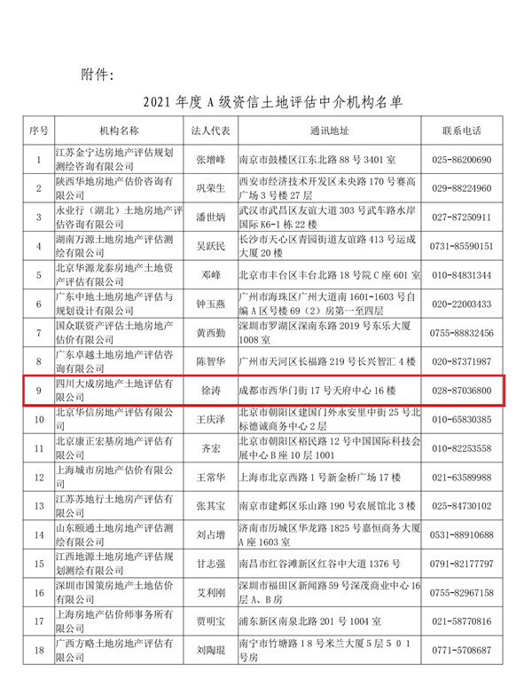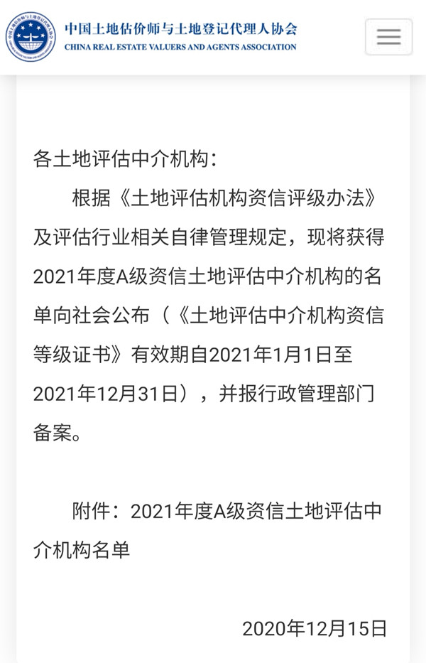 2020年12月15日,中國土地估價(jià)師與土地登記代理人協(xié)會通過官網(wǎng)正式發(fā)布了"關(guān)于印發(fā)2021年度A級資信土地評估中介機(jī)構(gòu)名單的通知"。