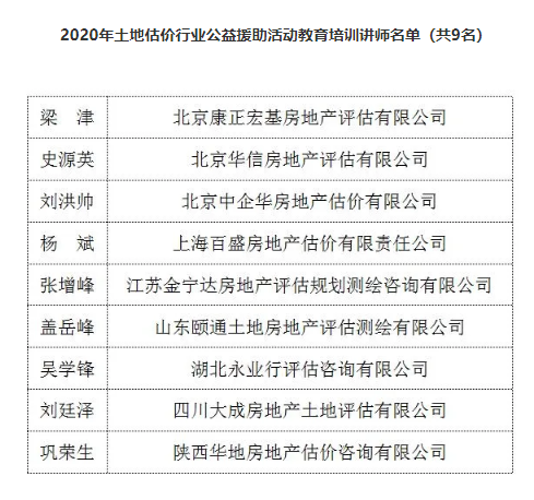 2021年3月9日,為表彰優(yōu)秀,樹立典型,鼓勵全行業(yè)積極主動參與土地估價行業(yè)公益援助活動,根據(jù)《土地估價行業(yè)公益援助管理辦法》(中估協(xié)發(fā)〔2020〕2號),中國土地估價師與土地登記代理人協(xié)會發(fā)布公告,授予我公司副總經(jīng)理劉廷澤先生及業(yè)內(nèi)其他參與公益援助活動的授課講師共9人 “教育培訓(xùn)講師”稱號。