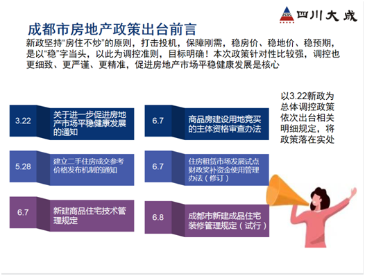 本次會議分享并解讀了《關(guān)于進一步促進房地產(chǎn)市場平穩(wěn)健康發(fā)展的通知》《成都市住房和城鄉(xiāng)建設(shè)局關(guān)于建立二手住房成交參考價格發(fā)布機制的通知》《商品房建設(shè)用地競買的主體資格審查辦法》《成都市新建商品住宅技術(shù)管理規(guī)定》《成都市新建成品住宅裝修管理規(guī)定(試行)》《住房租賃市場發(fā)展試點財政獎補資金使用管理辦法(修訂)》等一系列新政策以及集中供地等相關(guān)內(nèi)容。新政堅持“房住不炒”的原則,打擊投機,保障剛需,穩(wěn)房價、穩(wěn)地價、穩(wěn)預(yù)期,是以“穩(wěn)”字當頭,以此為調(diào)控準則,目標明確!本次政策針對性比較強,調(diào)控也更細致、更嚴謹、更精準,促進房地產(chǎn)市場平穩(wěn)健康發(fā)展是核心。
