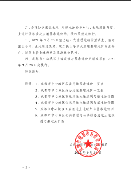 成都市中心城區(qū)新一輪土地定級與基準地價更新成果已于2021年9月18日在成都市規(guī)劃和自然資源局官方網(wǎng)站予以公布,該成果自2021年9月20日起執(zhí)行。