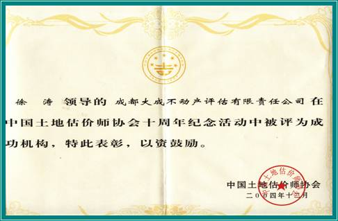 公司被評為土地評估成功機(jī)構(gòu) 2011-11-08 00:00:00        本網(wǎng)站 公司2004年被評為“1994-2004年土地評估成功機(jī)構(gòu)”。 二〇〇四年我公司被中國土地估價師協(xié)會評為成功機(jī)構(gòu)