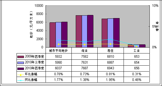 成都市中心城區(qū)2010年四季度地價(jià)水平較上季度有所上升,詳見(jiàn)下圖