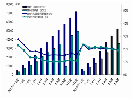 2013年1-8月,全國固定資產(chǎn)投資(不含農(nóng)戶)262578億元,比上年名義增長20.3%,增速比1-7月份增長0.2個(gè)百分點(diǎn),與去年同期基本持平。房地產(chǎn)開發(fā)投資52120億元,同比名義增長19.3%,增速比1-7月份回落1.2個(gè)百分點(diǎn)。其中,住宅投資35738億元,增長19.2%,增速回落1個(gè)百分點(diǎn),占房地產(chǎn)開發(fā)投資的比重為68.6%。從2011年以來,全國房地產(chǎn)開發(fā)投資、住宅投資增速持續(xù)下降,至2012年年末止住下滑趨勢,至今年年初上漲后保持相對平穩(wěn),可以看出房地產(chǎn)市場有一定回暖趨勢;住宅投資占房地產(chǎn)開發(fā)投資的比重持續(xù)穩(wěn)定在7成左右,說明住宅開發(fā)的資金投入并未因?yàn)槟瓿醯男抡{(diào)控政策減少。詳見圖
