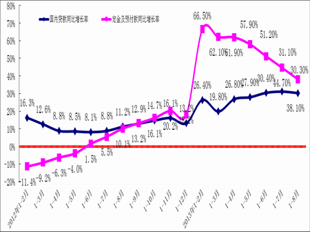 2012年1月,定金及預(yù)收款同比增長率達(dá)到歷史低點(diǎn),在經(jīng)歷今年年中的大幅上漲階段后,漲幅有所回落,但仍然處于穩(wěn)步回升階段。2013年1-8月,其平均同比增長率為38.1%,表明房地產(chǎn)開發(fā)企業(yè)銷售在觸底后開始持續(xù)上升,銷售僵局持續(xù)好轉(zhuǎn),房地產(chǎn)市場回暖趨勢明顯。詳見圖