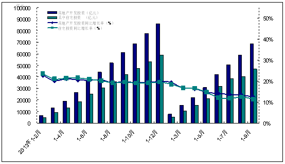 2014年1-9月,全國固定資產(chǎn)投資(不含農(nóng)戶)357787億元,同比名義增長16.1%,增速比1-8月份回落0.4個百分點,比去年同期回落4.1個百分點。房地產(chǎn)開發(fā)投資68751億元,同比名義增長12.50%,增速比1-8月份回落0.7個百分點。其中,住宅投資46725億元,增長11.3%,增速回落1.1個百分點,占房地產(chǎn)開發(fā)投資的比重為68.0%。2012年年末全國房地產(chǎn)開發(fā)投資、住宅投資增速止住下滑趨勢后上漲并保持在20%左右,但2013年8月以來,全國房地產(chǎn)開發(fā)投資、住宅投資增速持續(xù)下降,已跌破2012年年中時的低位,為6年以來最低位。詳見圖