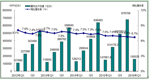 2016年一季度國內(nèi)生產(chǎn)總值158526億元,同比增長6.7%,從環(huán)比看,一季度國內(nèi)生產(chǎn)總值增長1.1%,增速有所放緩,整體呈現(xiàn)基本穩(wěn)定的趨勢。