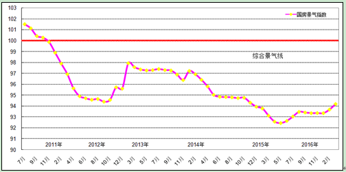 圖1-1-4: 2011年-2016年一季度年全國房地產(chǎn)開發(fā)綜合景氣指數(shù)對(duì)比圖