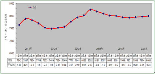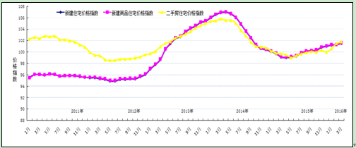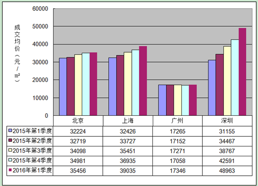 2016年第一季度,銀行再次下降銀行存款準(zhǔn)備金利率,營造發(fā)展更適宜的貨幣金融環(huán)境。受傳統(tǒng)“春節(jié)”假期的影響,一線城市新建商品住宅成交量有所下滑,但房產(chǎn)市場依然具有較強(qiáng)的活力,成交價(jià)格仍然呈現(xiàn)持續(xù)上漲的趨勢。