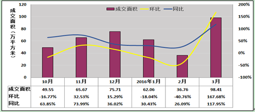 2016年第一季度,新建商品住宅季度總成交187.7萬平方米,環(huán)比減少22.7%,同比小幅上漲2.42%。月度來看,受上季度新建商品房集中成交,1月份成交量后續(xù)動(dòng)力不足,成交量有所下降,2月份受“春節(jié)”假期的影響,成交量有所下降,3月份隨著“春節(jié)”假期的結(jié)束,新建商品主城成交量集中爆發(fā),成交量漲幅較大。從整體上看,2016年一季度成交總量環(huán)比有所下降,但從整體上看新建商品房住宅成交量逐漸趨于平穩(wěn)、理性的發(fā)展。預(yù)計(jì)2016年2季度,成都市新建商品住宅成交量將平穩(wěn)回歸。見圖3-1-3。